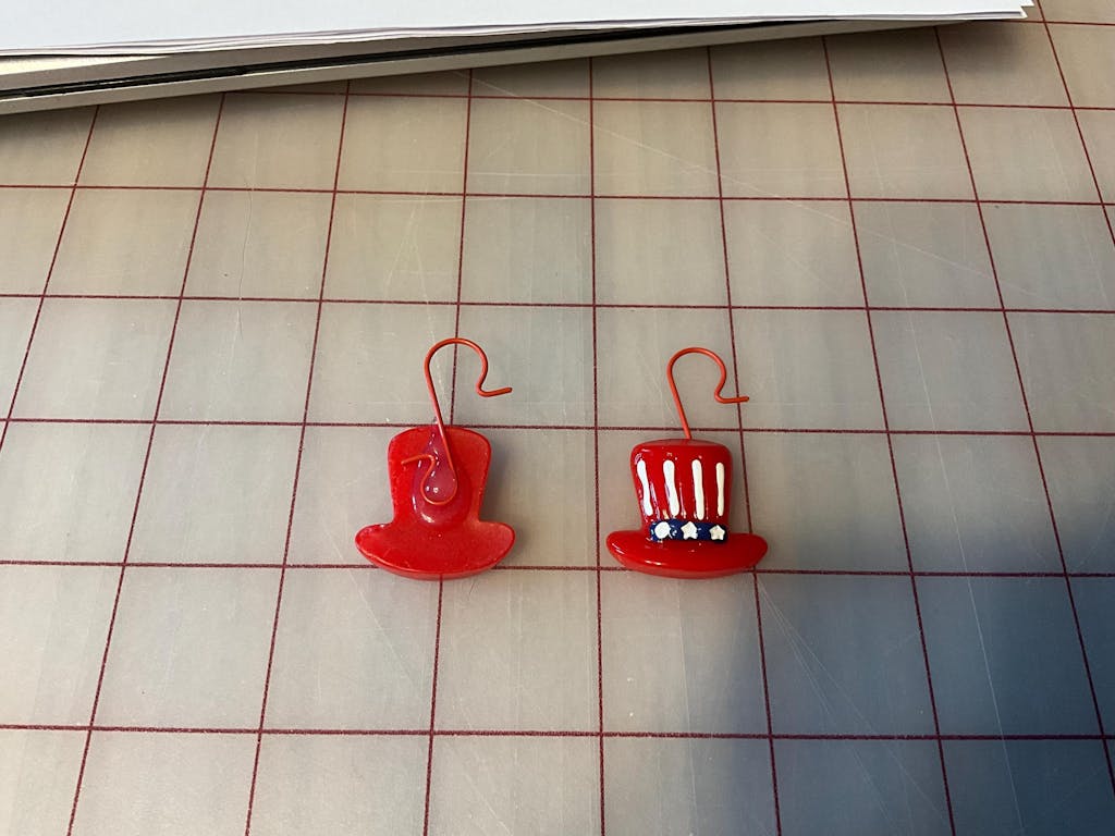 These are Uncle Sam Hat Flatback Charms American Flag Patriotic 4th Of July Cabochons Decoden  (10 pieces in bag). Really nice Uncle Sam's hat charms, hand painted so each one is unique; bright red with the American flag patter on each hat. Great for your next 4th Of July Holiday creation. A must add to your charm collection today!