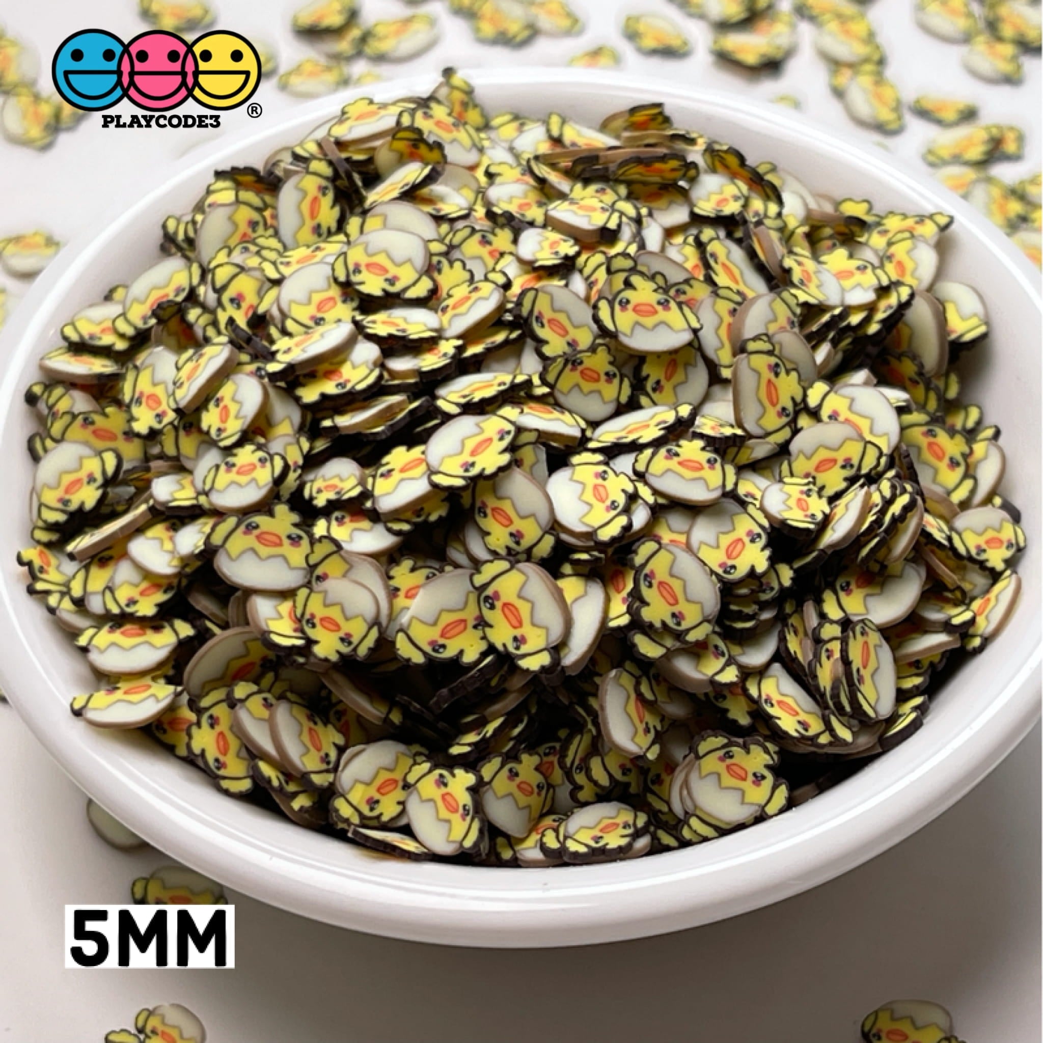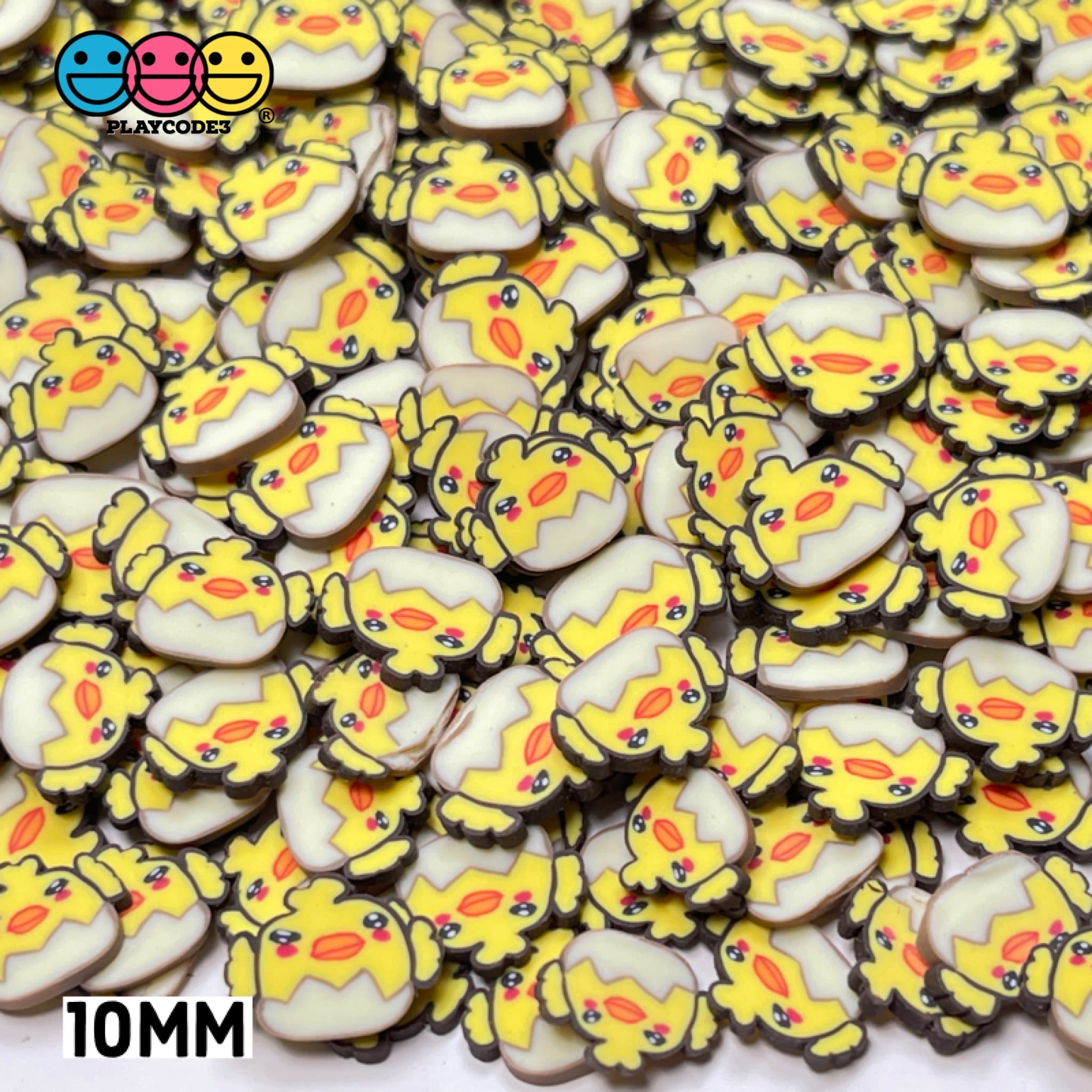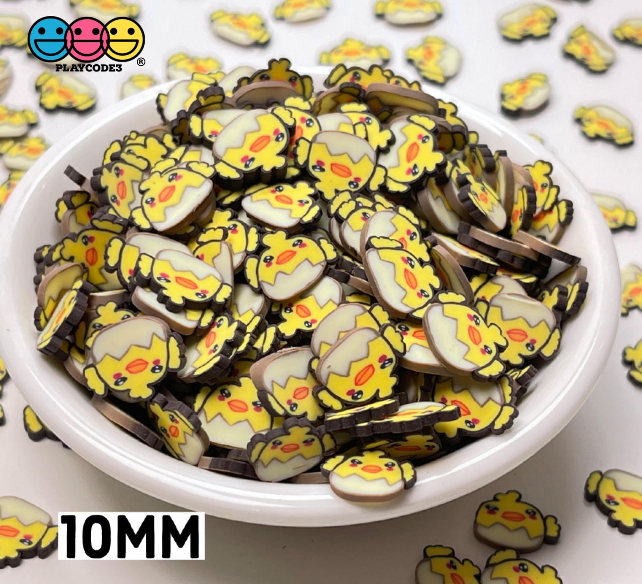 These are Chick Kawaii In Eggshell Fimo Slices Polymer Clay Chicks Eggshells Fake Sprinkle in bag sizes: 10/20/100 grams, fimo sizes: 10mm and 5mm (see picture for details size reference). So CUTE these yellow chick setting in their eggshell fimo slices! The details are amazing along with the bright yellow chicks! Nice for Easter Holiday or anytime you want to have some fun with a chicken theme creation! A must have for your crafting supplies collection!