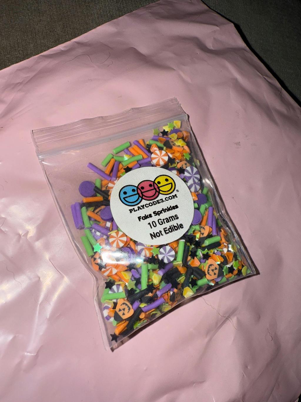 These are Happy Jack-O’-Lantern Halloween Mix Fimo Glitter Stars Diamonds Fake Polymer Clay Sprinkles Jimmies Funfetti in bag sizes: 10/20/100 grams, fimo size: 5mm (see picture for details size reference). Great Halloween theme fake sprinkle mix with happy jack-o’-lantern Fimo slices, purple confetti discs, orange & green peppermint Fimo slices, orange and purple fake sprinkles and topped off for a nice bling; small star and diamond glitter with yellow, orange and purple. This is really an awesome mix! Great for any slime, fake bake, tumbler, shaker card or any other Halloween embellishment you might need for your next project.  Note: other products that may be in picture is not included in this product, however we do have these items for sale as well.
