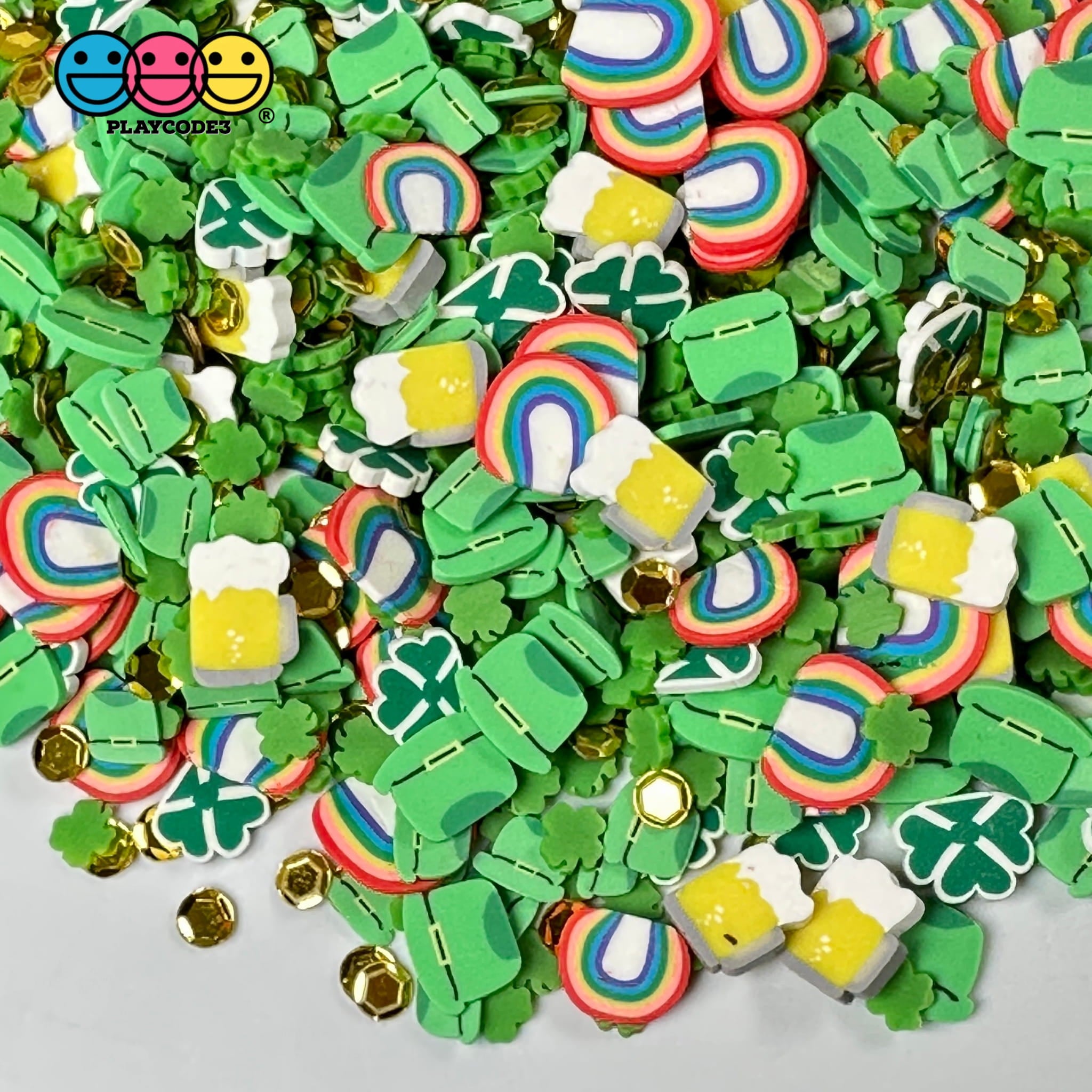 These are Leprechaun Party Mix Beer Rainbow Gold Coin Shamrock Hat Fake Sprinkle Confetti Funfetti in bag sizes: 10/20/100 grams. These perfect for all Saint Patrick's Day creations. Check out the 10 mm Fimo of Beer and Rainbows along with Shamrocks and Leprechaun hats! Lot of fun this fake sprinkle mix; it also has fake gold coin glitter to top it off! Great mix or Saint Patrick's Day Celebration!  Note: other products that may be in picture is not included in this product, however we do have these items for sale as well.