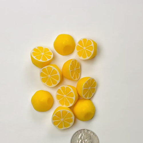 Adorable sliced lemon charms in bright yellow with realistic citrus details. These rounded pieces are not flat-back, giving them a more realistic and 3D fruit look great for fake bakes, slime toppings, and fruity summer crafts. There are 10 pcs in each bag and are 31 grams each.