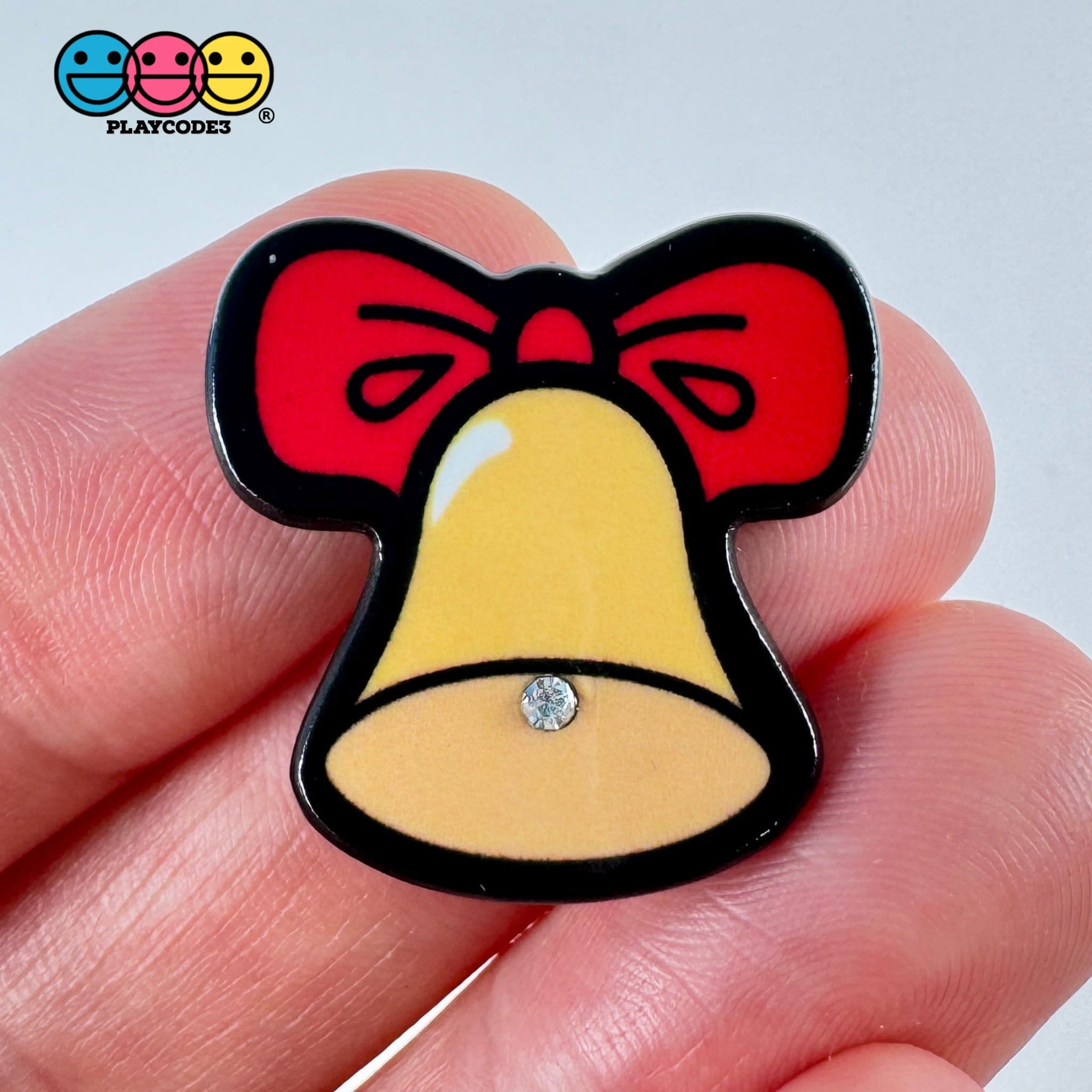 - Bell: A golden-yellow bell tied with a large red bow and a small acrylic diamond rhinestone, sized at 23x20mm (1 x 1 inch).