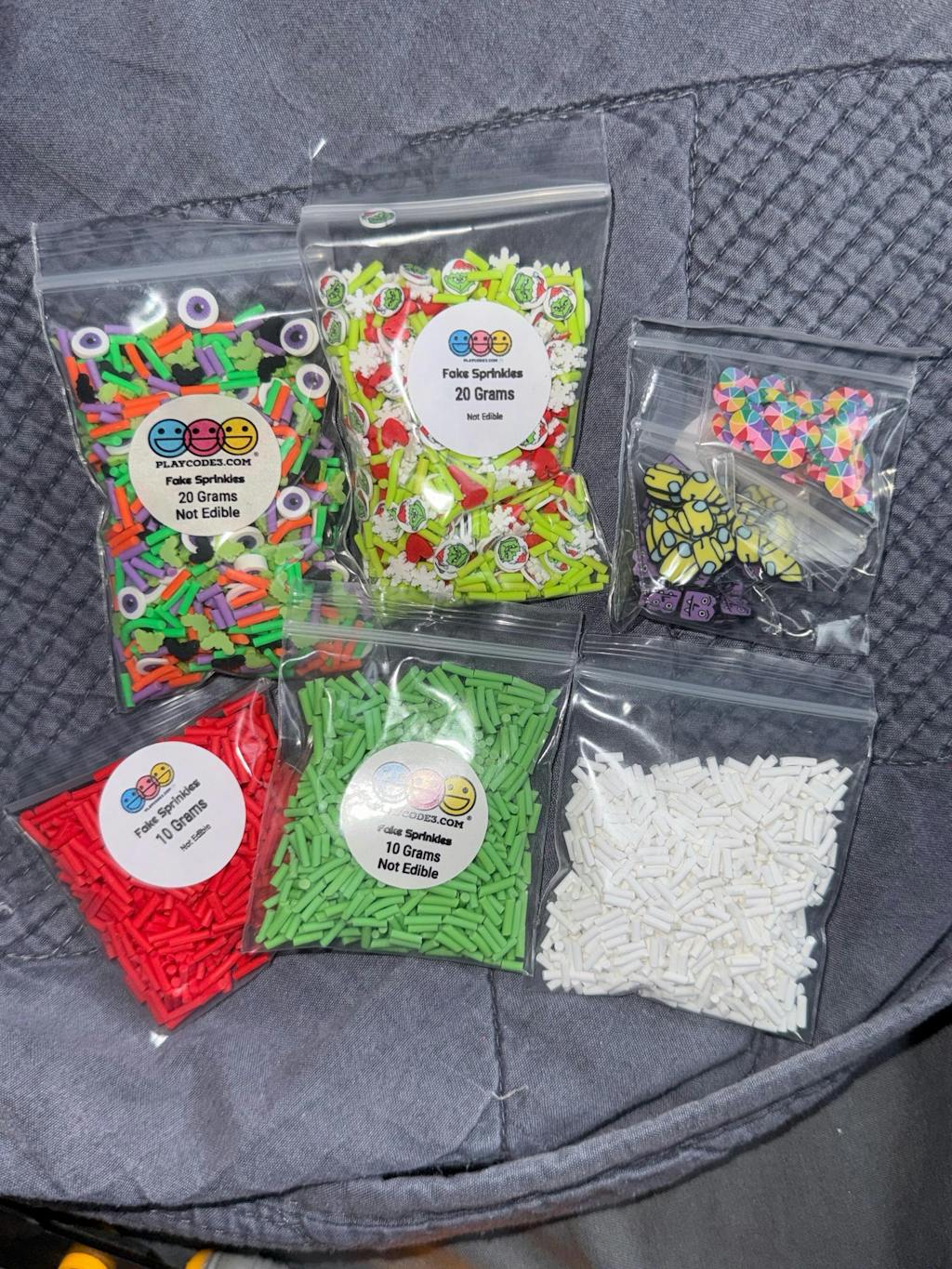 These are Batty Eyes Halloween Mix Fimo Fake Polymer Clay Sprinkles Bat Eyeballs Jimmies Funfetti in bag sizes: 10/20/100 grams, fimo size: 5mm (see picture for details size reference). A mix of green and black bat fimo slices along with some purple eyes and topped off with purple, green and orange fake sprinkles makes a fun Halloween Holiday sprinkle mix. Great for any slime, fake bake, tumbler, shaker card or any other Halloween embellishment you might need for your next project.  Note: other products that may be in picture is not included in this product, however we do have these items for sale as well.