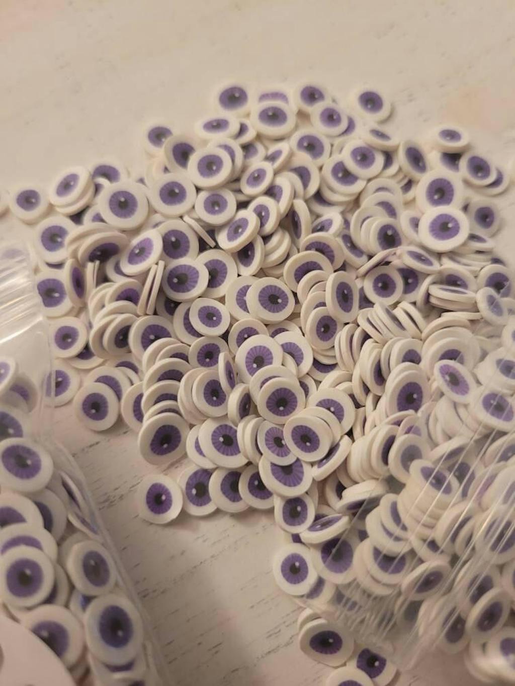 These are Purple Eyeballs Halloween Clay Fake Sprinkles. These spooky eyes are great for Halloween and you can use them for alien, zombie or any other creature you can think of! Boo! Good for nail art too! 3 sizes of the purple eyeball clay sprinkles with white iris. at 5mm. Note: Due to variations in pictures and your monitor the color may vary from the actual product color. 20 grams sprinkles will fill 3-5 8oz slime topping.