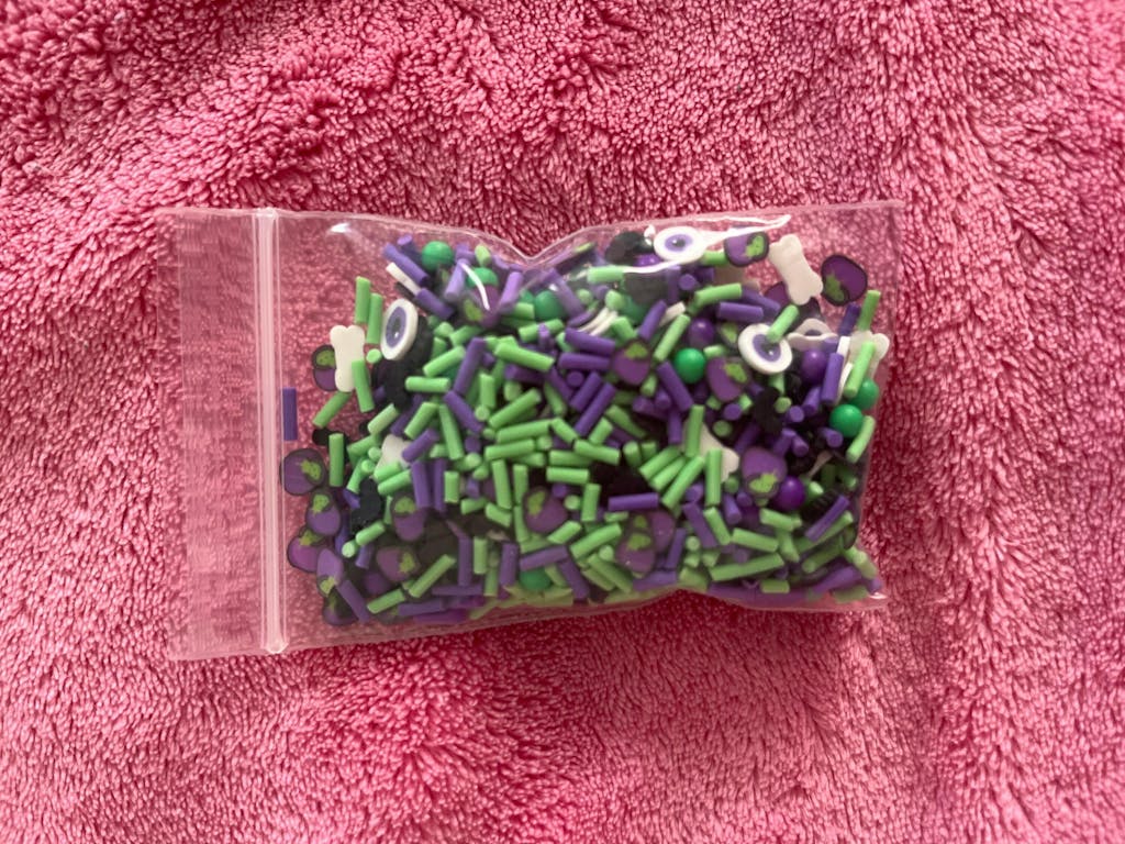 These are Witches Bone Brew Cauldron Eyes Bats Beads Fimo Mix Fake Clay Sprinkles Halloween in bag sizes: 10/20/100 grams, fimo size: 5mm and 10mm (see picture for details size reference). Did you know witches love bone soup! LOL! Here you have a real creepy cool mix of witches cauldron fimo, bats and bones with some purple eye of newt with purple and green sprinkles top off with dark blue, green and dark green beads to give you this PLAYCODE3 exclusive Halloween theme mix! Enjoy this really fun mix for your next Halloween creation!