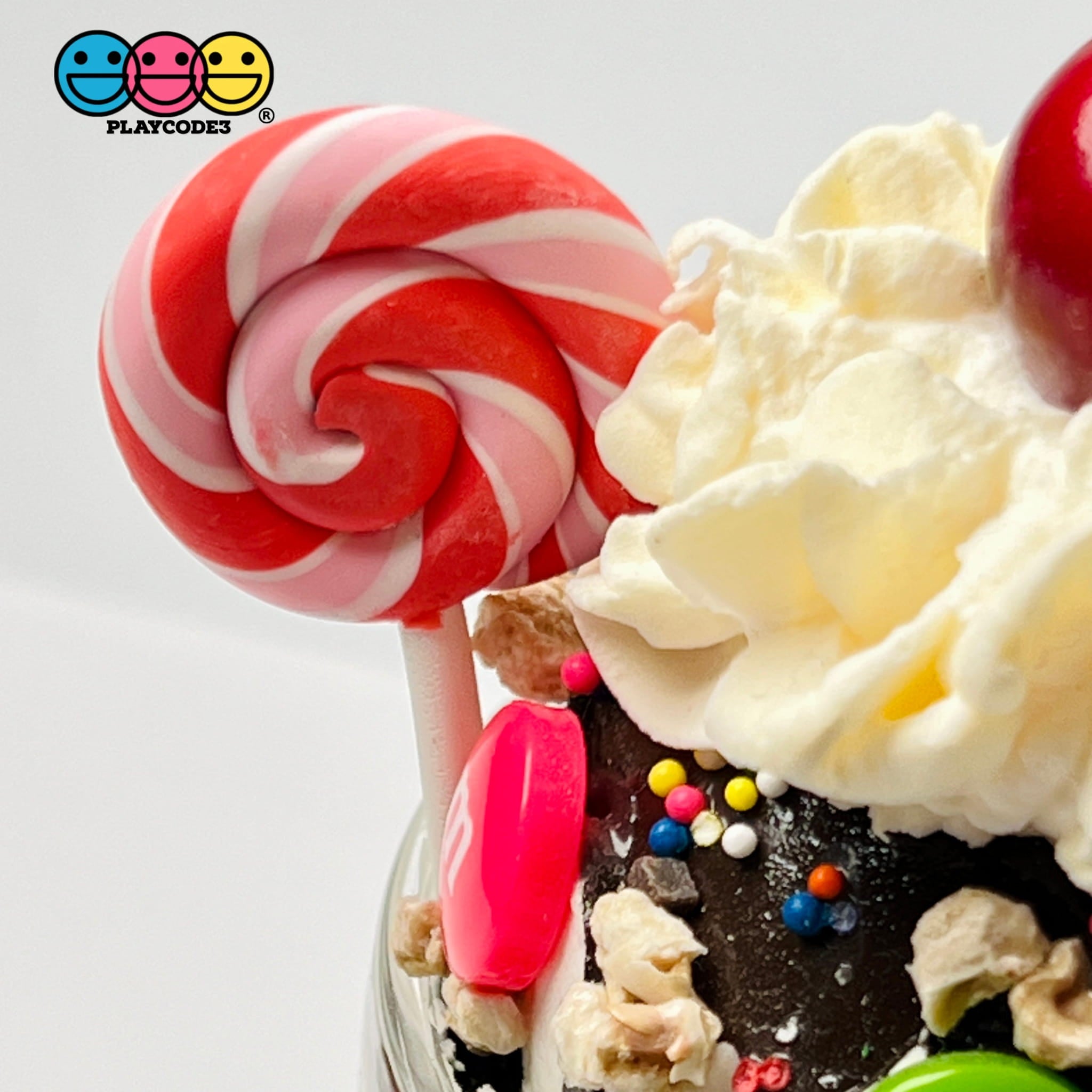 These are Lollipop Valentine's day Peppermint Swirl Red Pink Fake Food Charm Lollipops Polymer Clay Fake Bake Cabochons 10 pcs  (10 pieces in bag). These are really great fake lollipop with a red and pink peppermint looking swirl; great for a Christmas Holiday theme creation. NOTE: The lollipop stick size varies because these are handmade in production.  Add this to your collection of lollipop charms today.