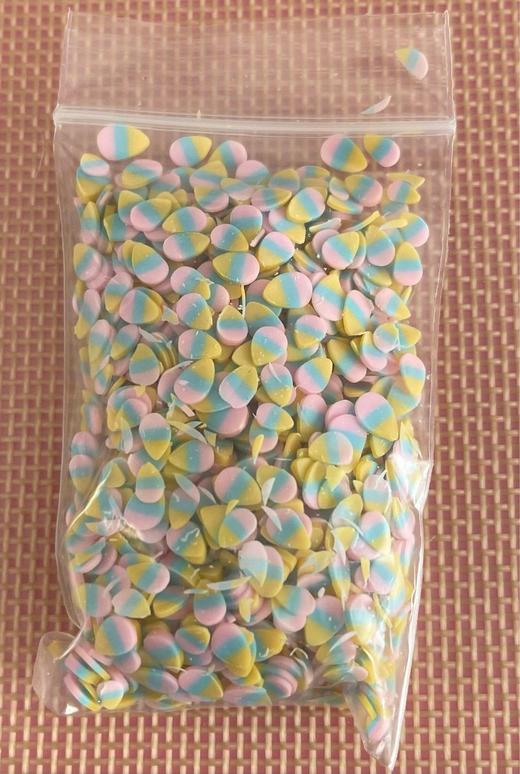 These are Candy Corn Pastel Colors Fimo Fake Sprinkles Funfetti Decoden 5mm in bag sizes: 10/20/100 grams, fimo size: 5mm (see picture for details size reference).  This is a celebration of Candy Corn fake sprinkle mix for Easter? A classic Halloween candy for a classic topping for your next project but with pastel colors of yellow, blue, and pick; it's different but may be fun to use even for Halloween.  Note: other products that may be in picture is not included in this product, however we do have these items for sale as well.